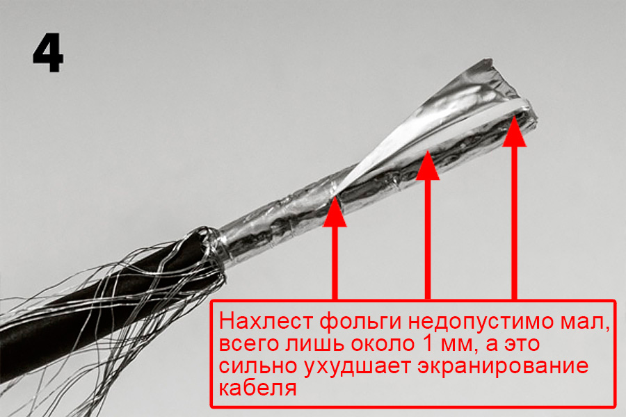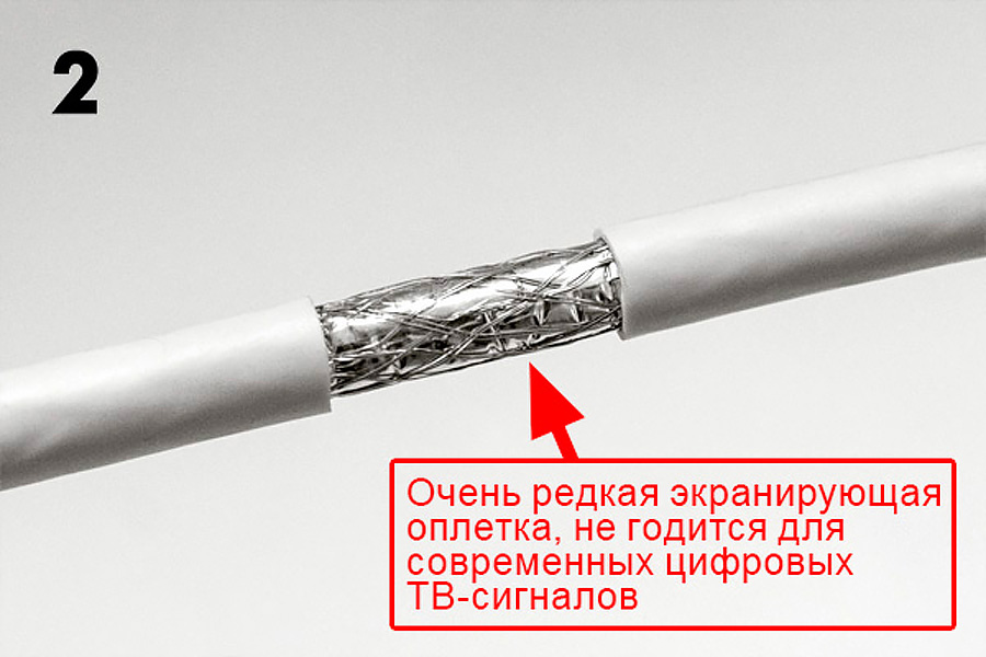 Важнейшим и вопиющим фактом является то, что нахлест фольги практически отсутствует (!!!). Он даже не минимален, как в вышеописанном черном ТВ-кабеле (в котором нахлест был всего лишь 1 мм), — здесь он просто отсутствует. Это приводит к тому, что экранирующая компонента кабеля работает как «решето», и о передаче ТВ-сигналов высокой четкости (что уже начинается в России) речь идти просто не может. Такой примитивный «кабель-провод» соберет все возможные помехи, даже от включенного рядом чайника или утюга. Налицо грубая экономия материала алюминиевой фольги и примитивный подлог: покупателю «всучивают» то, что через несколько лет применить будет уже невозможно.