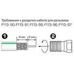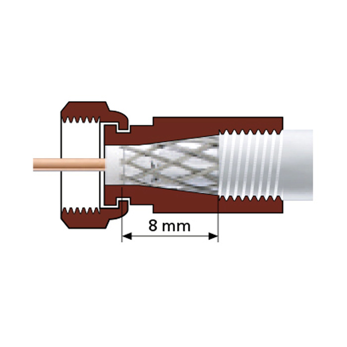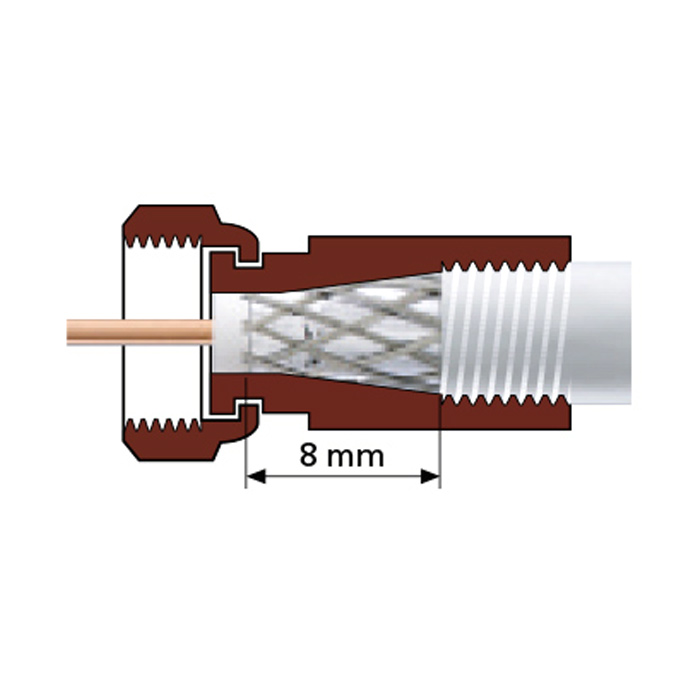 F-коннектор премиум-класса с повышенной прочностью соединения. Предназначен для подключения стандартного кабеля 75 Ом, с диаметром внешней оболочки от 4.8 до 5.2 мм к различным ТВ-устройствам (делители, усилители, антенны).